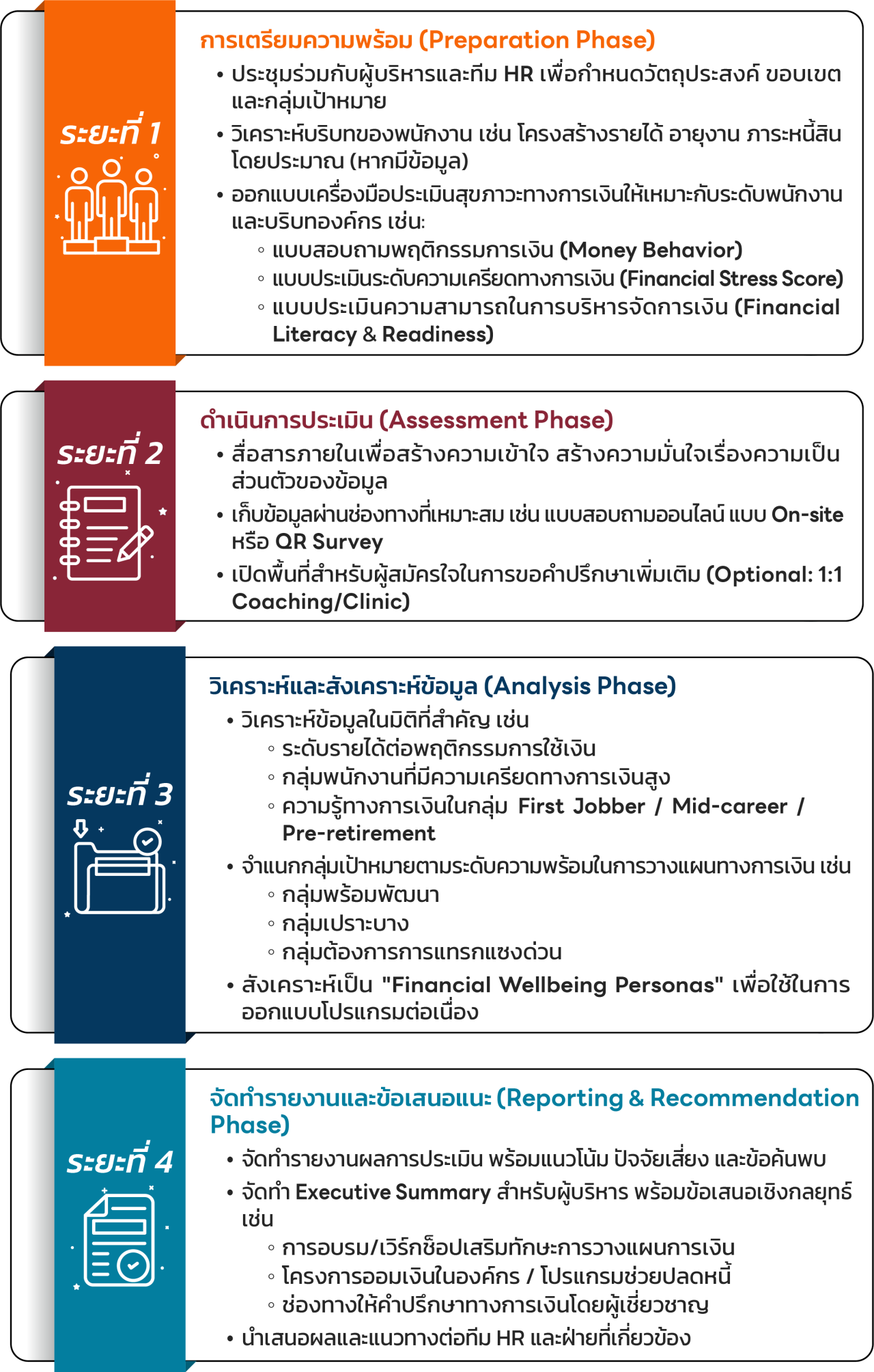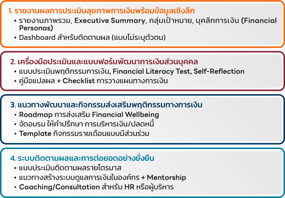 บริการ Financial Wellbeing Assessment จึงถูกออกแบบมาเพื่อช่วยให้องค์กรเข้าใจสถานะทางการเงินของพนักงานอย่างเป็นระบบ โดยไม่ละเมิดความเป็นส่วนตัว พร้อมทั้งวิเคราะห์พฤติกรรม ความเครียด และแนวโน้มความมั่นคงทางการเงินของบุคลากรในแต่ละกลุ่ม ซึ่งสามารถใช้เป็นฐานในการออกแบบโปรแกรมส่งเสริมสุขภาวะทางการเงินที่ตรงจุด เช่น เวิร์กช็อปวางแผนการเงิน การให้คำปรึกษาเฉพาะราย หรือการสร้างแรงจูงใจในการออมและลงทุน