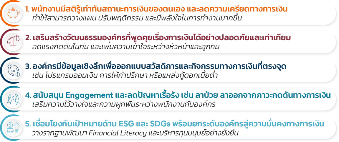 เช่น Financial Literacy, Investment Planning หรือ Debt Management ที่ตรงตามความต้องการจริง - สนับสนุนการสร้างวัฒนธรรมองค์กรที่ใส่ใจสุขภาวะทางการเงิน